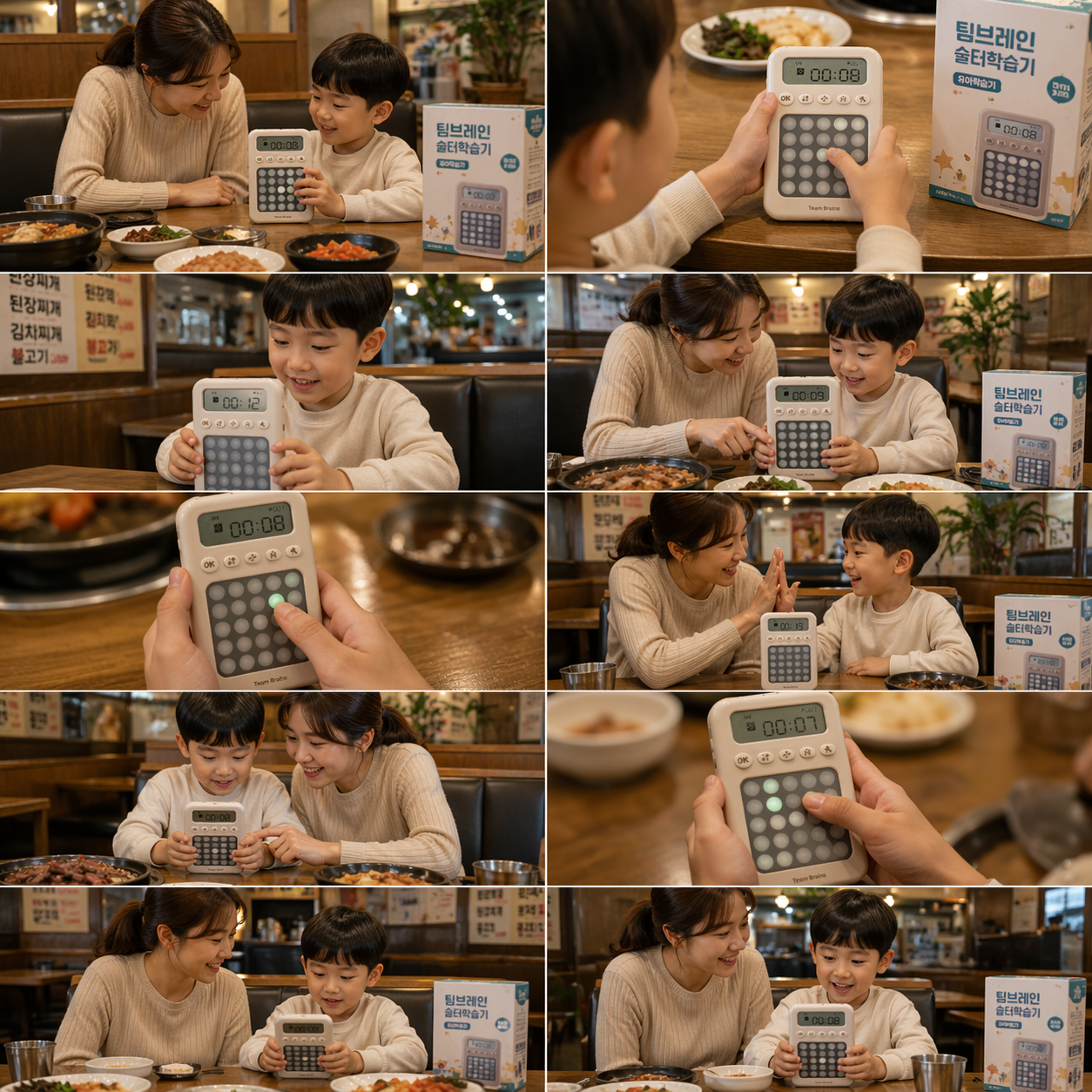 이 학습기를 가장 잘 쓰고 있는 순간이 언제냐고 물으면, 저는 주저 없이 "식당에서"라고 답합니다. 아이와 외식을 하면 음식 나오는 20~30분이 가장 힘든 시간인데요. 슐터 학습기 몇 장 꺼내서 하다 보면 어느새 음식이 나와 있습니다. 이 흐름이 정말 자연스럽습니다.